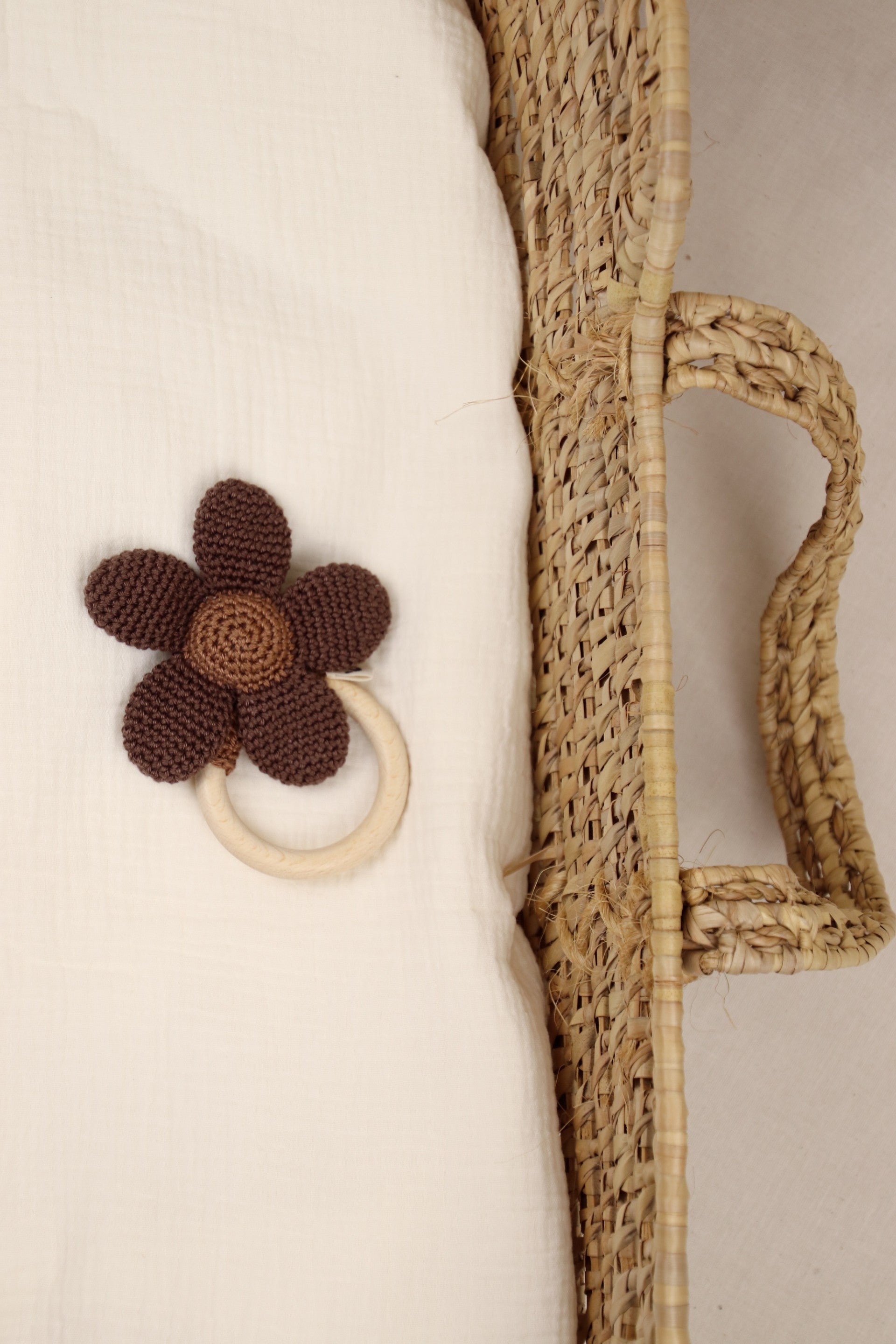 De houten ring is gemaakt van glad, onbehandeld beukenhout en ligt precies goed in kleine handjes. De gehaakte bloemblaadjes wiebelen zacht mee, en binnenin klinkt een subtiel rammeltje dat nieuwsgierigheid en spel meteen aanwakkert. Ideaal tijdens het spelen, maar ook een fijne troost bij het doorkomen van de tandjes.