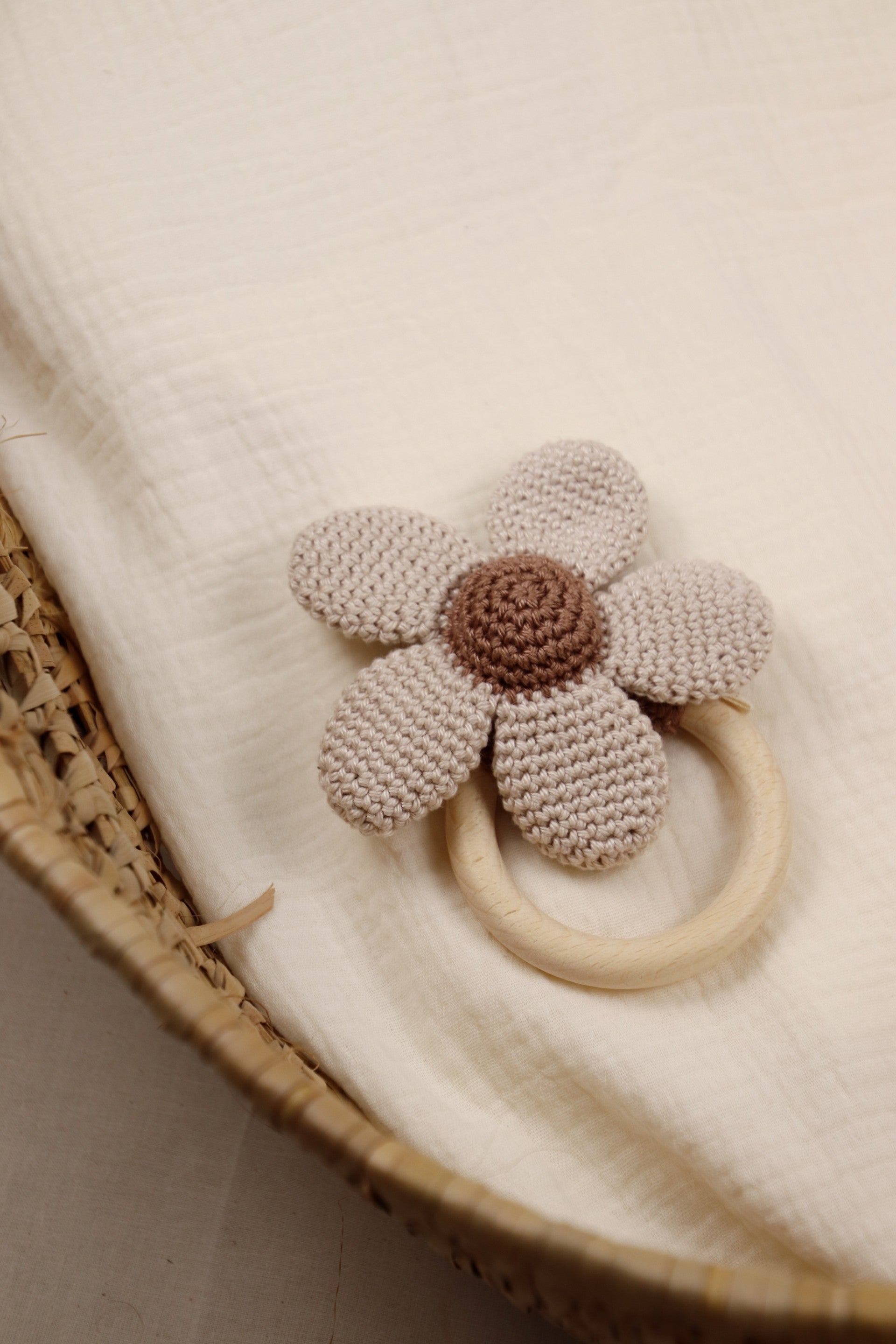 De houten ring is gemaakt van glad, onbehandeld beukenhout en ligt precies goed in kleine handjes. De gehaakte bloemblaadjes wiebelen zacht mee, en binnenin klinkt een subtiel rammeltje dat nieuwsgierigheid en spel meteen aanwakkert. Ideaal tijdens het spelen, maar ook een fijne troost bij het doorkomen van de tandjes.