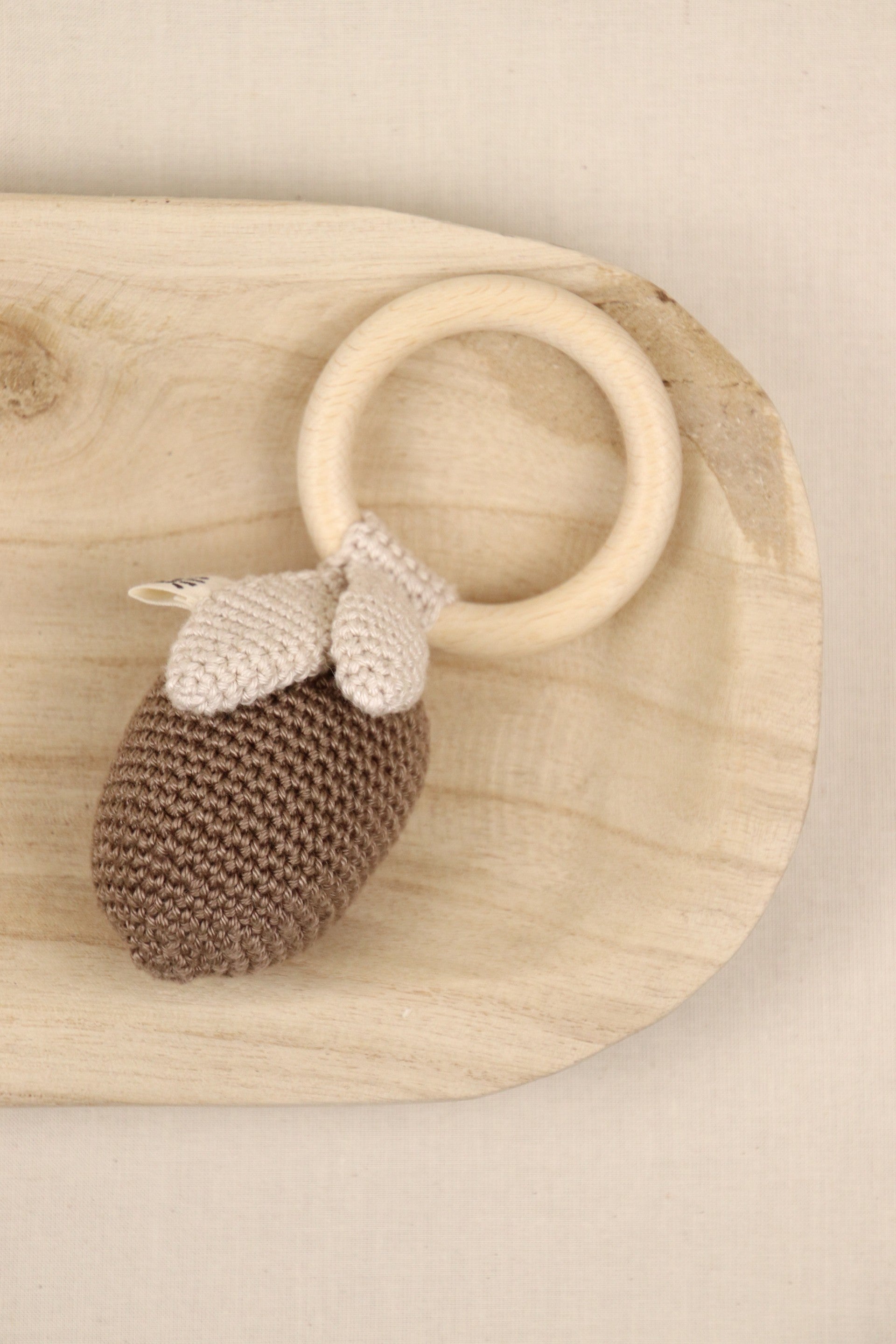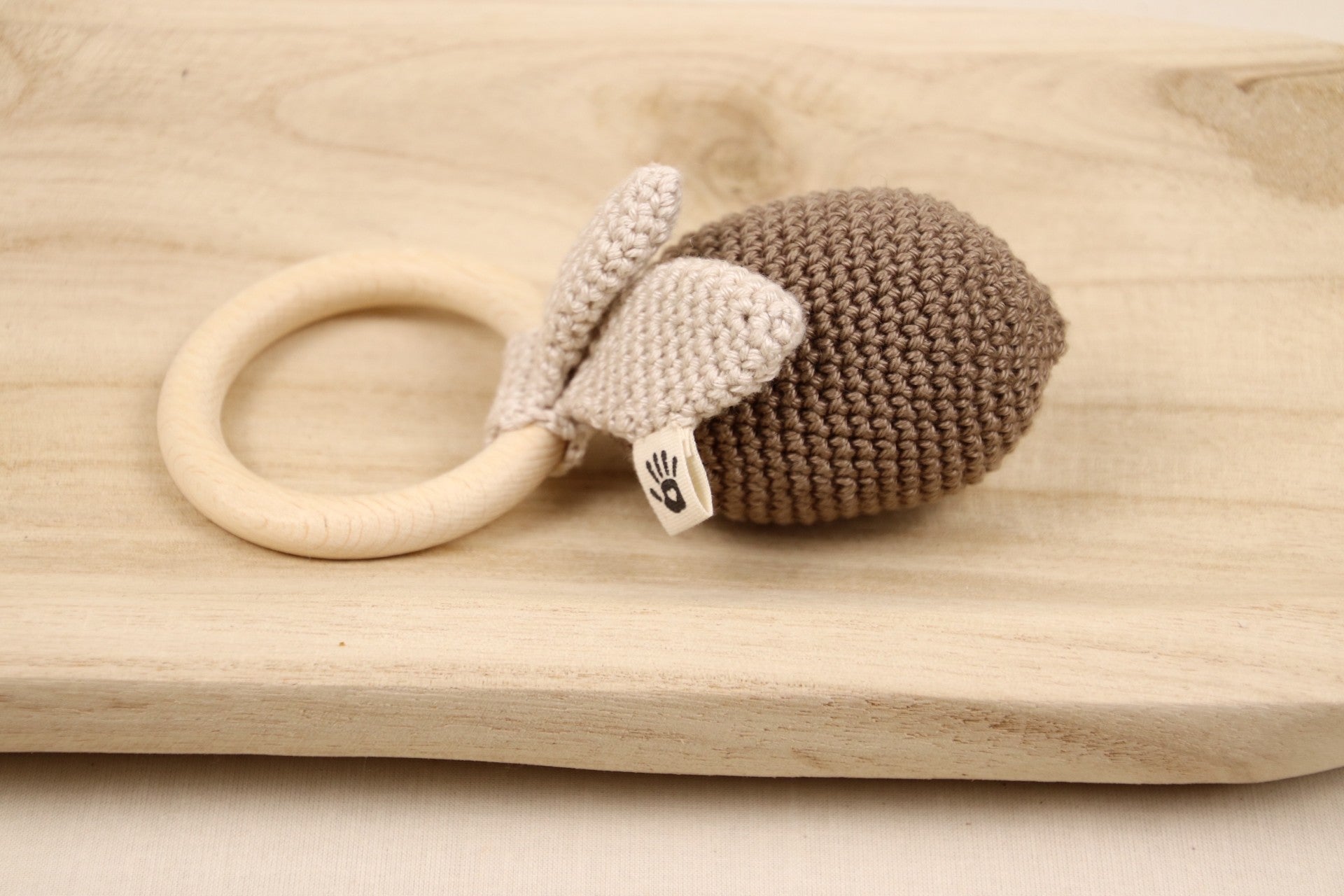 De houten ring is gemaakt van glad, onbehandeld beukenhout en ligt precies goed in kleine handjes. De gehaakte bloemblaadjes wiebelen zacht mee, en binnenin klinkt een subtiel rammeltje dat nieuwsgierigheid en spel meteen aanwakkert. Ideaal tijdens het spelen, maar ook een fijne troost bij het doorkomen van de tandjes.