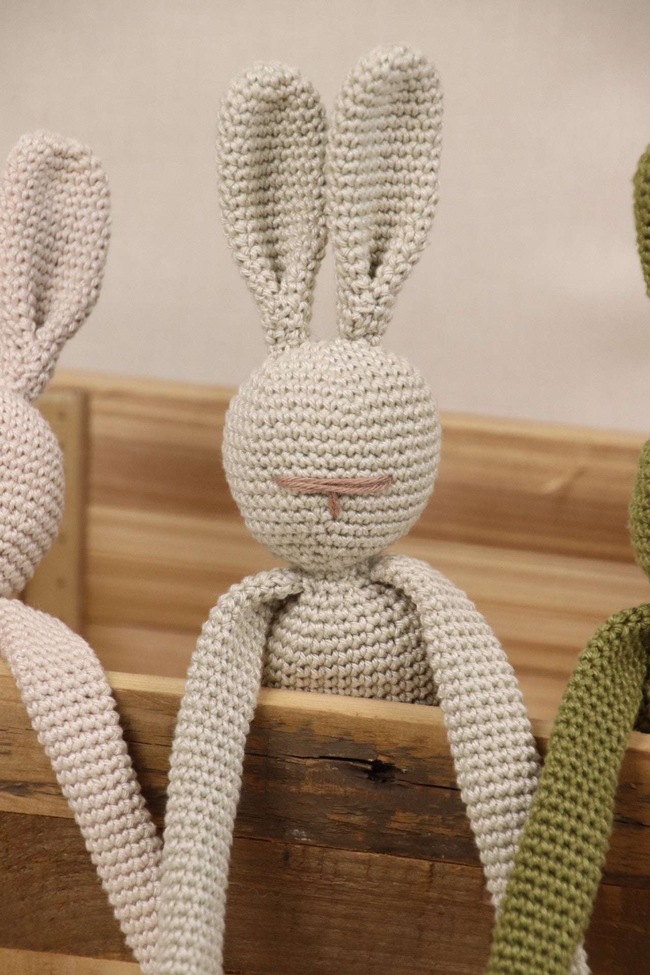 Dit lieve handgemaakte konijntje is met zorg gehaakt van 100% hoogwaardig katoen. Zacht, veilig en duurzaam. Een echte beste vriend voor het leven.