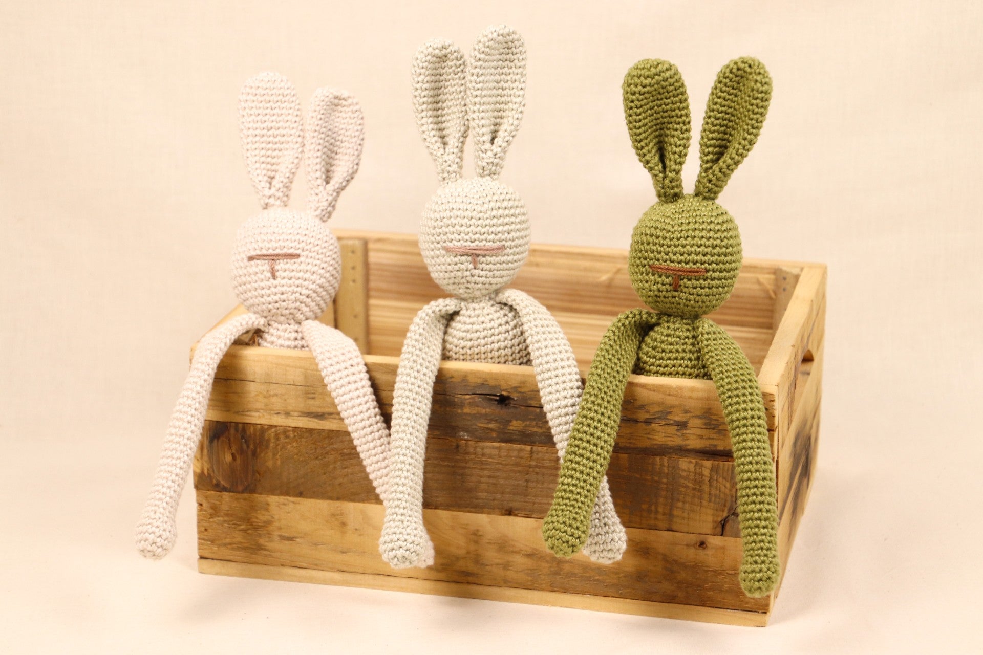 Elk konijn heeft zijn eigen karakter en wordt met de hand gemaakt, steekje voor steekje. Door het natuurlijke katoen voelt het knuffeltje warm en vertrouwd aan, en is het geschikt voor zelfs de kleinste kinderhandjes.
