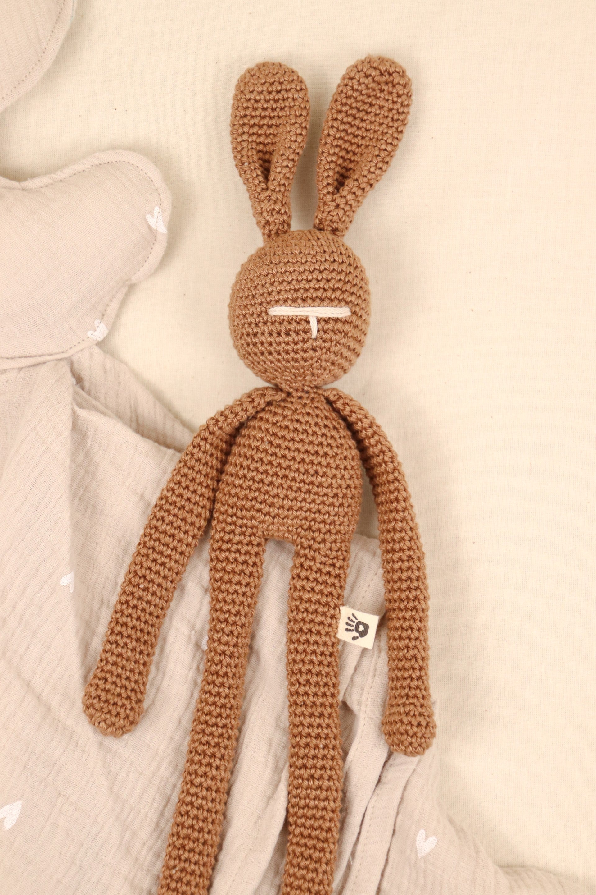 Dit lieve handgemaakte konijntje is met zorg gehaakt van 100% hoogwaardig katoen. Zacht, veilig en duurzaam. Een echte beste vriend voor het leven.