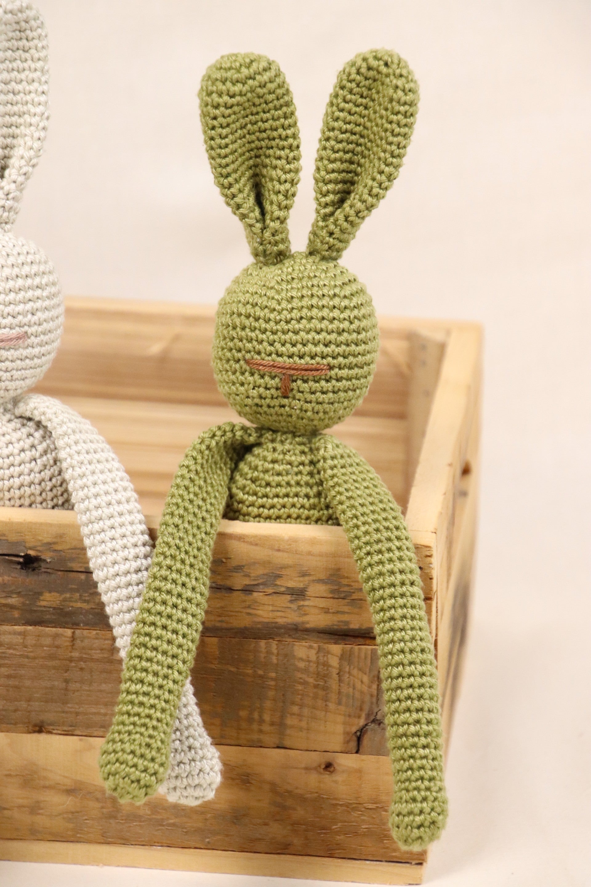 Dit lieve handgemaakte konijntje is met zorg gehaakt van 100% hoogwaardig katoen. Zacht, veilig en duurzaam. Een echte beste vriend voor het leven.