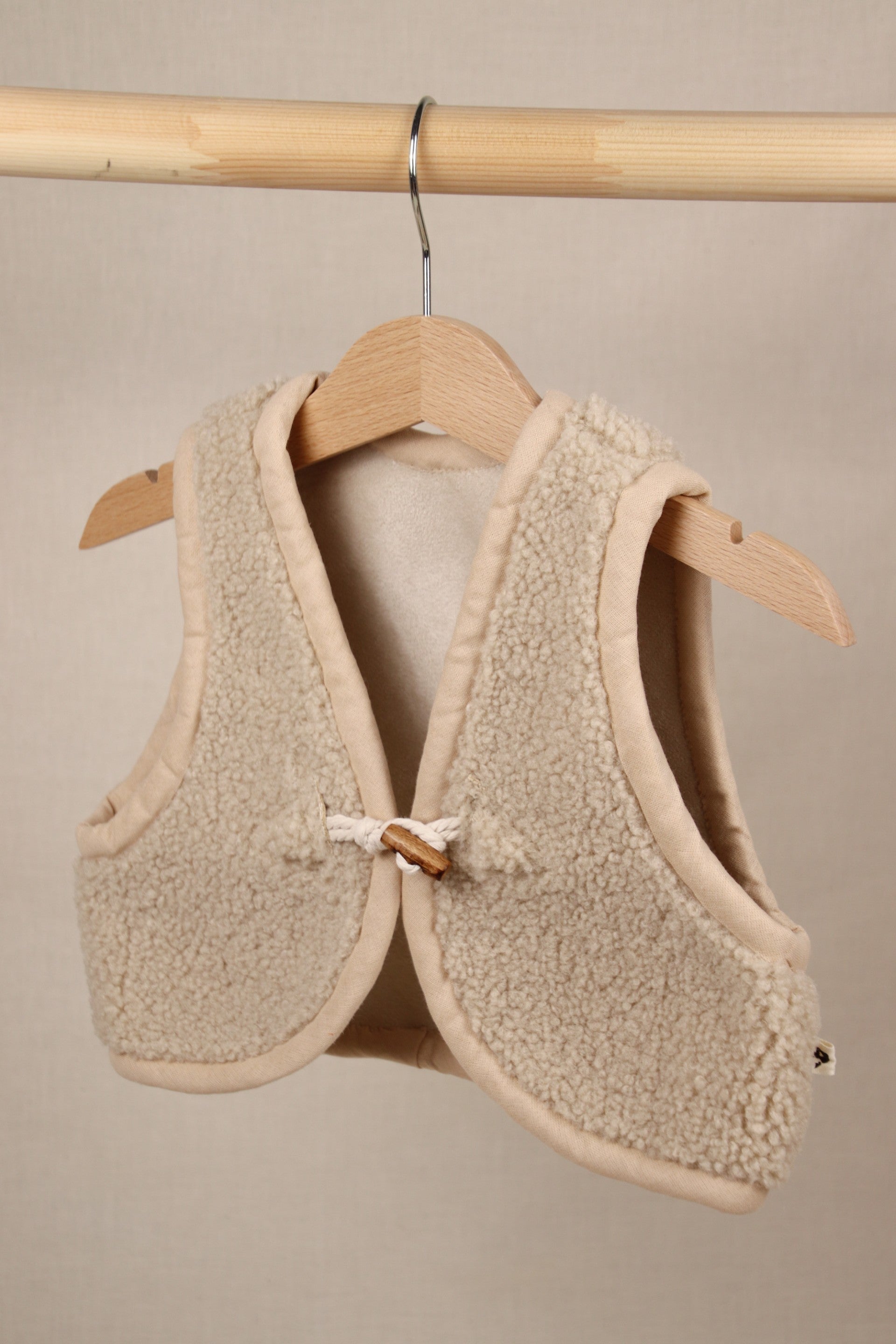 Het schattige houtje-touwtje knoopje aan de voorkant maakt het giletje helemaal af en zorgt ervoor dat het makkelijk aan en uit te trekken is, zelfs voor kleine handjes.